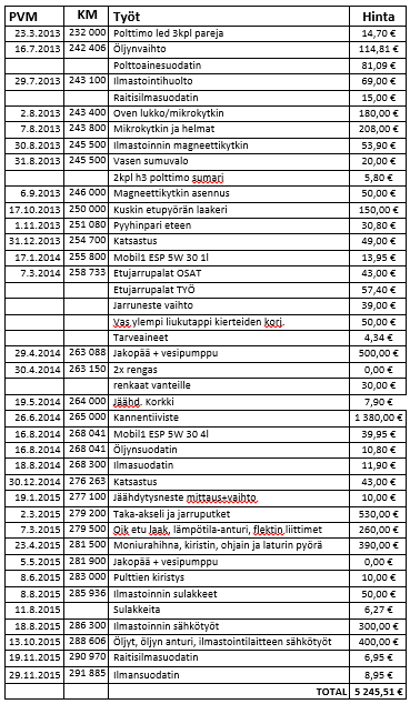 Kaikkiaan näitä kuluja meni 5245,51 euroa, mikä on aika paljon rahaa mielestäni. Ja tämähän oli vasta alkua. Tuosta puuttuvat siis vielä polttoaineet, verot, vakuutukset ja auton arvon aleneminen. Näillekin toki olen tehnyt taulukon, olkaa hyvät: