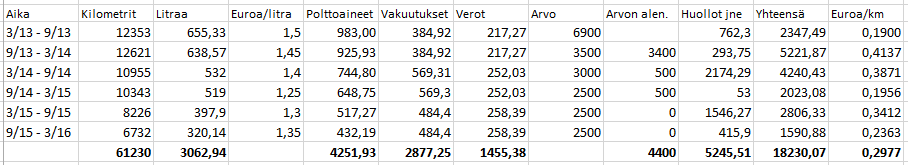 Aiemmin kyselin lukijoilta arviota paljonko yksi ajettu kilometri maksaa. Minun tapauksessani se maksaa 18 230,07e / 61 230 km = 0,2977e/km. Eli pyöreästi 30snt/kilometri. Siitä voi jokainen laskea paljonko se työmatka, kauppareissu tai muu ajomatka maksaa.